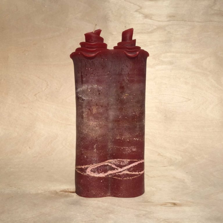 Die Hochzeitskerze Achtsamkeit ist ein nostalgisch anmutendes, handgemachtes Unikat in tiefroter durchgehender Färbung und weißer Patina.
