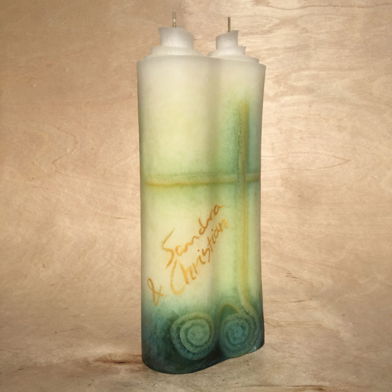 Tragen Sie bitte in das Fenster “Beschriftungstext” (über den Button „In den Warenkorb“) die Worte & Zahlen (Namen, Datum, oder anderes) in der Reihenfolge ein, in der sie auf der Kerze erscheinen sollen.