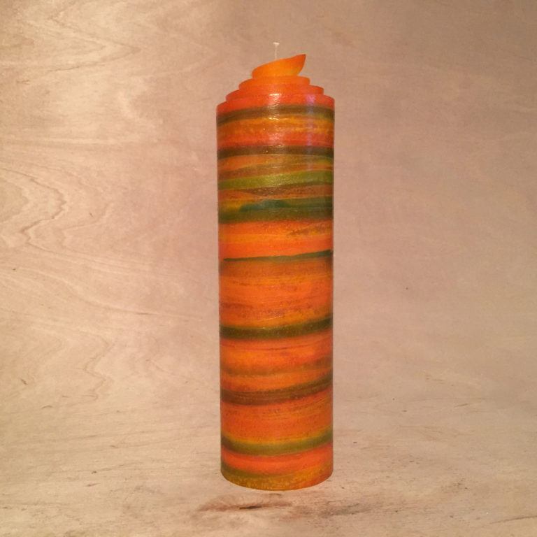 Die orange grüne gerollte Streifen Kerze kann ein wunderbares Geschenk, genau die passende Deko für Ihre Wohnung oder für das eigene Wohlbefinden zum anzünden & genießen als Kerzenliebhaber sein.