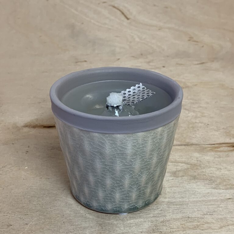 Jetzt können Sie Ihren Restewachs mit dem Schmelzlicht “Renatus” für den Innenbereich im grau-grünlichen Tontopf Verwerten/Recyceln.