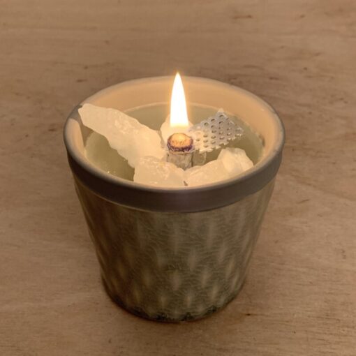 Zusammenfassung Schmelzlicht „Renatus“ für den Innenbereich im grau-grünlichen Tontopf