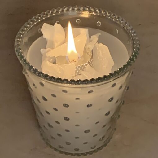- mit Wachs aufgefüllter Schmelzlicht Windlicht “Renatus” im Glastopf mit Punkten