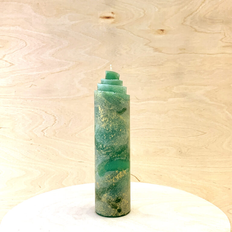 Die Kerze”Tiefgrund”, schillert in ausgeprägten Grün-Tiefen, mit Goldeinwürfen und verschiedenen Strukturverläufen